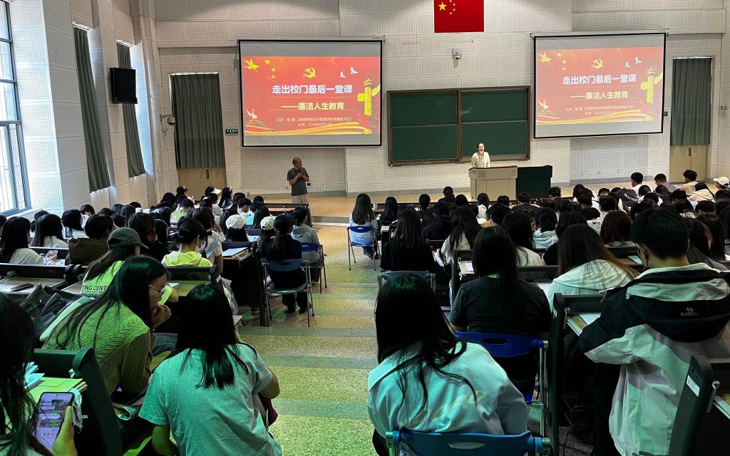 党委副书记鲍鲲开展“走出校门最后一堂课——廉洁人生教育”、诚信感恩教育、遵纪守法教育。她强调,毕业生要时刻保持廉洁自律、诚实守信意识,离校后也要自觉遵守法律法规,为社会树立正能量。